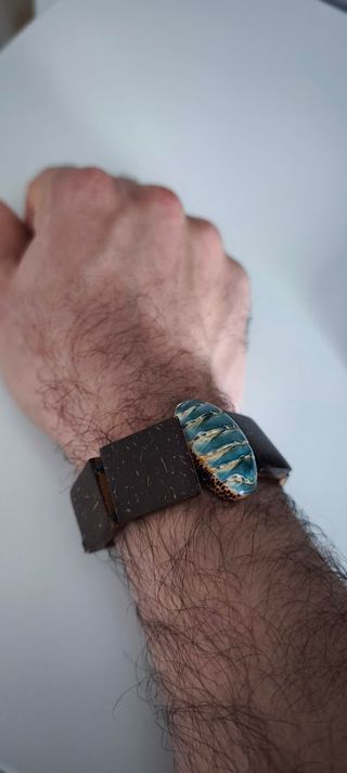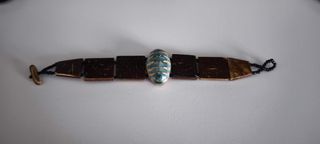 Pulsera artesanal con un diseño único. - Elaborada en madera. - Detalle central con tonos azules y dorados.