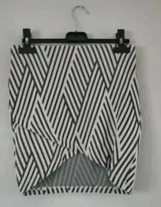 Falda con un llamativo estampado geométrico en blanco y negro. Su diseño cruzado en la parte delantera le da un toque moderno y original. - Diseño cruzado frontal. - Estampado geométrico. - Tejido cómodo.