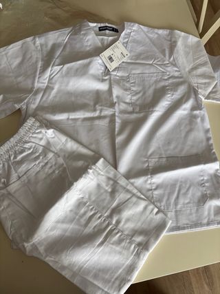 Conjunto de uniforme de trabajo de dos piezas. - Camisa de manga corta con cuello en V. - Pantalón con cintura elástica y bolsillos.
