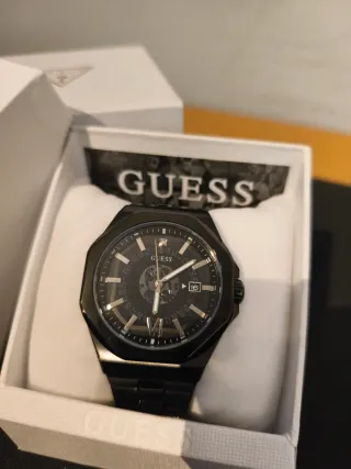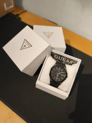 Elegante reloj de la marca Guess en color negro y mecanismo de cuarzo. Presentado en su caja original y con garantía de más de un año todavía. Completamente nuevo, sin usar ni una sola vez. Reloj comprado por más de 300€ en perfecto estado. Incluye dos piezas a mayores de la correa para hacerlo más grande y ajustarlo. Precio negociable.