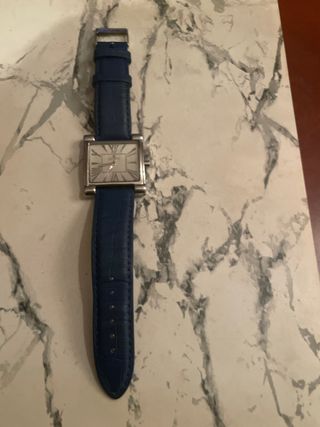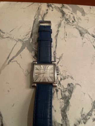 Elegante reloj de la marca Pertegaz con correa azul. - Esfera plateada con números romanos. - Correa de piel azul. - Diseño rectangular.