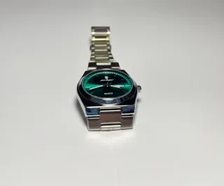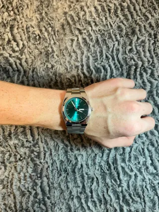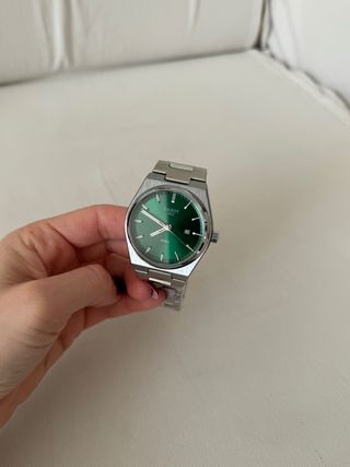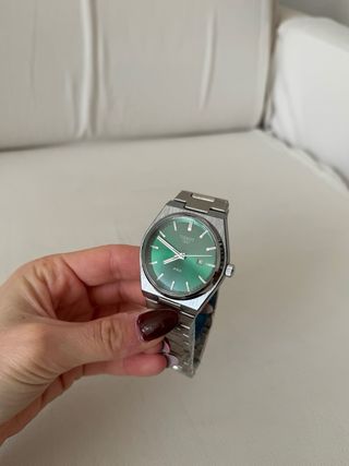 Elegante reloj Tissot PRX con una llamativa esfera verde y detalles plateados. - Diseño moderno y deportivo. - Brazalete de acero inoxidable.