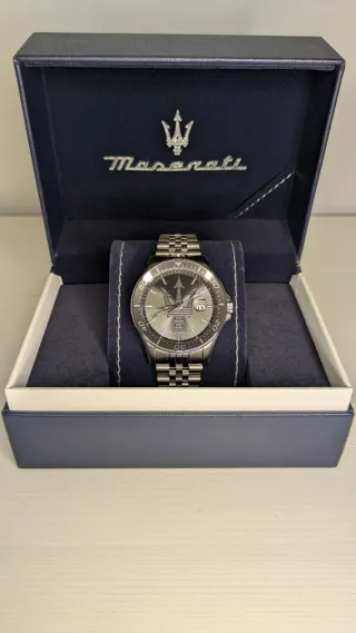 Elegante reloj Maserati con detalles dorados y esfera negra. Se vende por no usarse, fue un capricho absurdo al que no le di utilidad... - Diseño deportivo y sofisticado. - Brazalete metálico. - Caja original incluida.