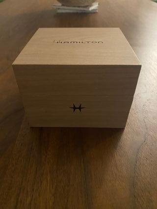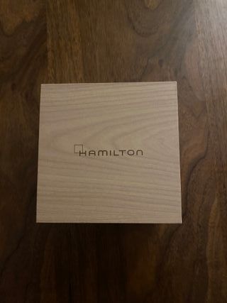 Elegante reloj Hamilton con diseño de eslabones. De 40mm funciona con el pulso. - Caja de madera con logo de Hamilton. - Símbolo de Hamilton en la parte inferior de la caja.