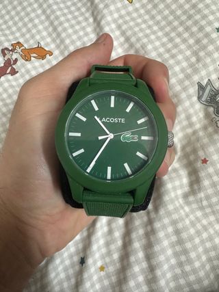 Reloj Lacoste original. Caja y correa en color verde. Funciona correctamente. 43 milímetros caja de resina Movimiento de cuarzo japonés con pantalla analógica. Banda de silicona con hebilla Resistente al agua hasta 30 m Estado muy bueno, sin marcas de uso Diseño deportivo y casual, muy cómodo para el día a día. Precio negociable