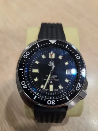 Reloj de pulsera Tactical Frog con movimiento automático. Un accesorio de buceo con un diseño clásico y funcional. - Bisel giratorio unidireccional. - Esfera negra con marcadores luminosos. - Correa de caucho negra. - Resistencia al agua de 200 metros. - Cristal Zafiro