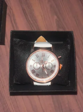 Elegante reloj de pulsera Geneva con un diseño sofisticado. - Esfera con números romanos. - Correa de cuero blanco. - Detalles en tono dorado. Sin ningún uso Caja incluida