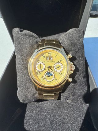 Elegante reloj Lanscotte con diseño astronómico y automático. - Esfera en tono dorado con detalles intrincados. - Indicadores de día, mes y fase lunar. - Edición limitada y numerada. - Sin caja ni papeles. - Caja, bisel y correa de Acero Inoxidable Antialérgico, dorado mediante baño en Oro de Primera Ley IPG. - 5 complejidades relojeras: ventana de calendario, subesfera día, subesfera mes, subesfera 24 h y función “Noche & Día”.