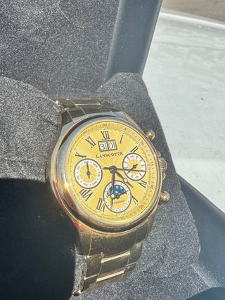 Reloj de muñeca Lanscotte Chronograph pata hombre, acero quirúrgico y oro de primera Ley. Función cronógrafo, Correa de acero 316L Quirúrgico y Antialérgico bañado en Oro de Primera Ley mediante tratamiento IPG. Bisel interior con marcaje de segundos. Dial con guilloché central geométrico. 2 subesferas del cronógrafo (minutos y segundos). Subesfera función 24h. Ventana del calendario. Agujas e indicadores horarios con marca de luminiscencia. Trasera, lateral y corona con grabado exclusivo Lanscotte. Cristal de zafiro. Cierre de seguridad. Mecanismo de cuarzo de máxima precisión. Water Resistant 20 ATM. CRISTAL CON PEQUEÑO GOLPE.