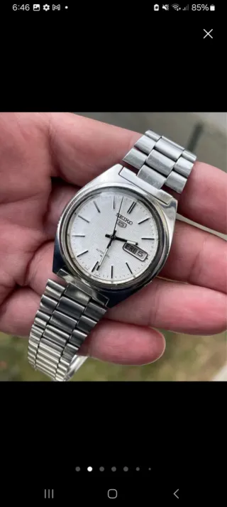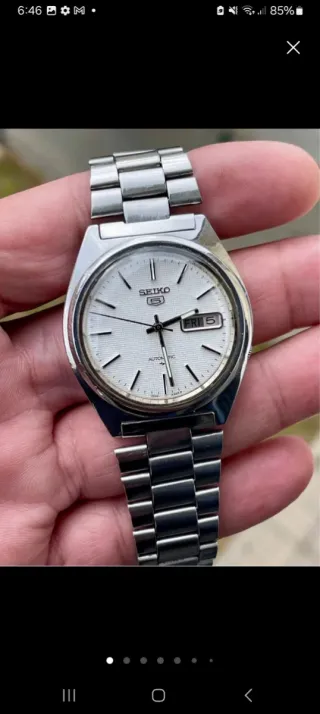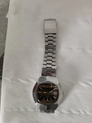 🕰️ Seiko 5 Automático Vintage – Caja Cuadrada – Dial Árabe / Inglés Vendo Seiko 5 automático original, modelo vintage con caja cuadrada y un diseño elegante y poco común dentro de la serie Seiko 5. 🔹 Características: • Movimiento automático Seiko • Calendario día y fecha con dial bilingüe (inglés / árabe) • Caja cuadrada de acero, estilo clásico y atemporal • Esfera clara con índices aplicados • Correa de acero en muy buen estado 🔹 Estado y funcionamiento: • Funciona correctamente • Cambio de día y fecha preciso • Pequeña muesca en la esfera, situada junto al logotipo “Seiko 5”, apenas visible (detalle únicamente estético)