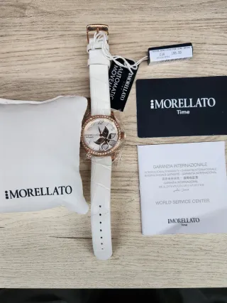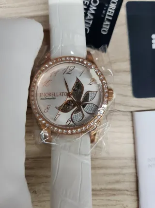 Elegante reloj Morellato con correa blanca y detalles dorados. Un accesorio sofisticado para el día a día. - Sin Caja - Esfera con diseño floral. - Bisel adornado con cristales. - Movimiento automático.