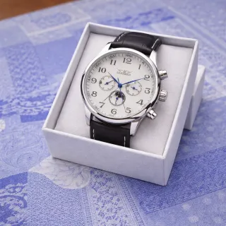 Elegante reloj de pulsera para hombre de la marca Andre Belfort. Presenta una esfera con detalles y un diseño clásico. - Correa de piel negra. - Caja de acero plateada. - Indicador de fase lunar. - Correa con cierre de hebilla.