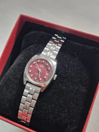Elegante reloj Oris Star para mujer, con un diseño clásico y sofisticado. -Caja 25mm diámetro -Estuche incluido - Esfera de color rojo. - Correa de metal plateada ORIGINAL Y COMPLETA. - Ventana de fecha. - Movimiento automático de 21 joyas. -Correa no apta para todas las muñecas -Funciona a la perfección, lubricado.