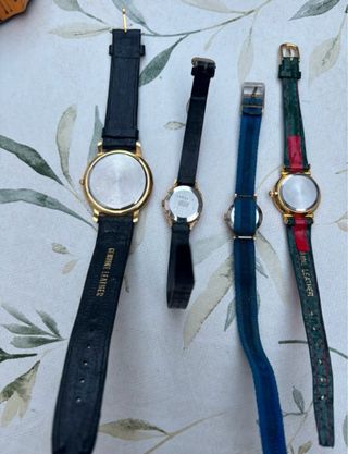 Conjunto de cuatro relojes de estilo vintage, ideales para coleccionistas o para añadir un toque retro a tu look. Cuatro relojes, dos movimiento de cuarzo, dos automáticos en perfecto estado alguna correa deteriorada. Los cuarzo son años 90 y Boticelli reloj cuarzo Gucci años 60 correa de charol reloj titán 17 Rubís IncaBlock y Reloj Micro 15 rubis años 60 funcionan todos