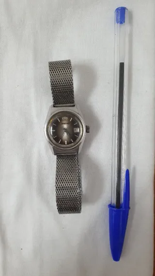 Reloj de pulsera para mujer de la marca Orient.Automatico, es nuevo de antiguo stock.es muy pequeño modelo de mujer.pieza difícil de encontrar en este estado.solo reloj, no tengo caja ni papeles.Un saludo - Esfera de color azul. - Correa de eslabones plateada.