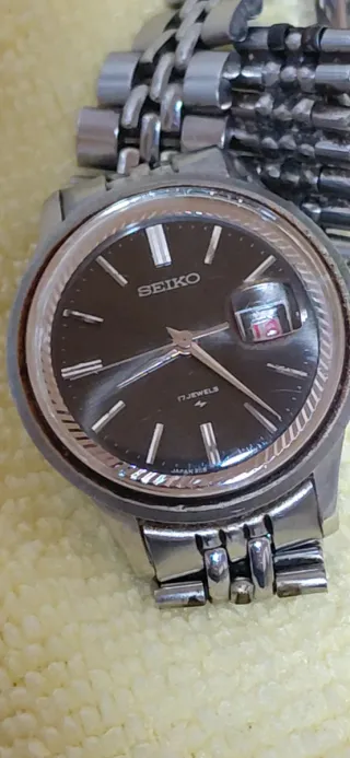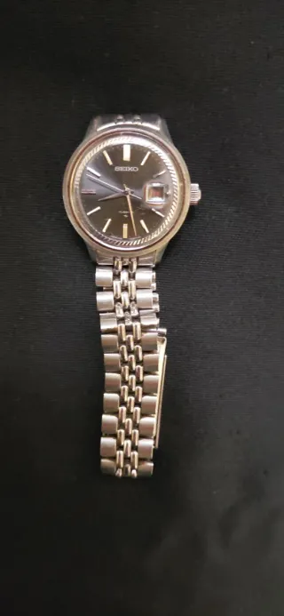 Auténtico Seiko automático de mujer (referencia 2118-0340). Una joya mecánica que no necesita pilas, funciona con el movimiento. 100% original japonés. Detalles: Bisel estriado, esfera antracita y cristal con lupa. Estado: Vintage real. Se vende tal cual (necesita limpieza y el cristal tiene marcas de uso). Medida: Correa original de 11,5 cm (abierta). Ideal para muñeca fina. IMPORTANTE: La correa se puede ampliar fácilmente añadiendo eslabones adicionales o sustituyéndola por una de piel si se prefiere. Precio: 60€ (NO NEGOCIABLE).