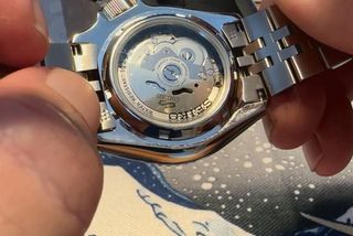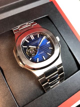 Reloj Seiko modificado con un diseño inspirado en el Nautilus y Open Heart. La esfera presenta un llamativo color azul con líneas finas. - Mecanismo automático visible. - Correa de eslabones metálicos.