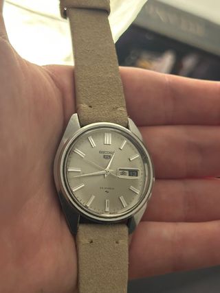 Reloj Seiko 5 vintage con movimiento automático y cara blanca de aproximadamente 33mm. Es un reloj con correa de acero inoxidable ajustable y esta cuenta con todos los eslabones. Es elegante, práctico y bonito para el día a día. Tiene una pequeña marca de uso en el cristal como bien se puede apreciar en las fotos, ni se nota pero aviso para que no haya mal entendidos.
