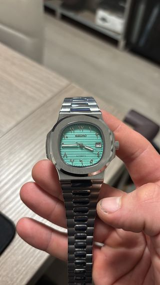 Reloj Seiko modificado con esfera turquesa dial arabic, inspirado en el diseño Nautilus. - Tiffany blue - Caja y brazalete de acero inoxidable. - Esfera de color turquesa con índices árabes. - Ventana de fecha. - Movimiento automático.