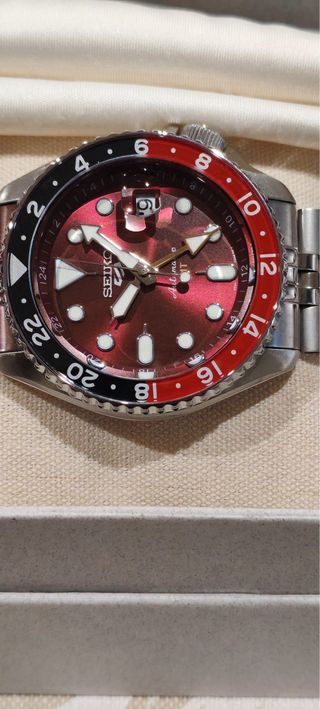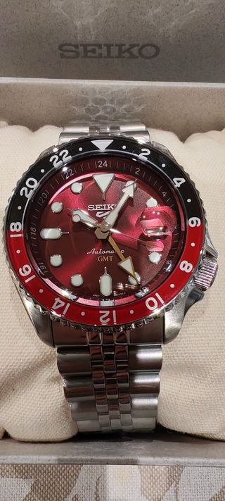 INFO POR PRIVADO VENTA PRESENCIAL O POSIBILIDAD DE ENVIO DIRECTO DE MI CONTACTO DE CONFIANZA CON ACCESO A SEIKO OFICIAL Reloj automático Seiko 5 Sports jubilee con función GMT. EDICION LIMITADA PASSION RED, que presenta una llamativa esfera roja y un bisel bicolor. - Reestreno. - Full Set. - Movimiento automático. - Función GMT. - Bisel giratorio bidireccional. - Pulsera jubilee.