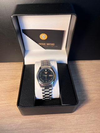 Seiko 5 Automatic 21 Jewels Ref. 7019-6081. Fabricado en JULIO 1974. ¡50 años de historia en estado MINT (parece NUEVO)! ✨ LO QUE LO HACE ÚNICO: 1. 🌍 Rareza: Calendario bilingüe ÁRABE e INGLÉS. Edición exportación muy cotizada. 2. 💎 Lujo: Esfera negra "Black & Gold" con detalle piedra preciosa a las 12. 3. ⚙️ Mecánica: Calibre 7019 (21 Rubíes). Cambio rápido de día pulsando corona. Funciona perfecto. DETALLES: • Medidas: 36mm (clásico elegante). • Estado: Cristal impoluto, caja pulida y armis acero original. 📦 Envío rápido, protegido y vendedor serio. ¡Escríbeme!