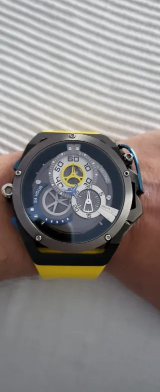 Reloj de diseño moderno con detalles en gris y amarillo. Diámetro de la caja: 48 mm Grosor de la caja: 19,6 mm Material de la caja: Acero inoxidable 316 L Cristal: Cristal K1 de doble cúpula con revestimiento antirreflectante (ambos lados) Correa: FKM de doble compresión Revestimiento: IPB de grado A (0,6 Mic Tic ±20 %, PVD) Resistencia al agua: 5 ATM Corona: A presión con doble junta tórica Movimiento automático de 3 h: Cronómetro Miyota 9015 Movimiento de cuarzo: Miyota Js 00 Función de la esfera: Cronógrafo automático de 3 manecillas Funciones de la esfera: Segundero central, Contador de 12 h (Cronógrafo de 60 segundos), Contado