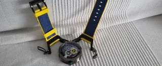 Reloj MWC Dephtmaster 1000m automático con correa de tela militar. - Caja de acero PVD negro. - Cristal de zafiro. - Bisel de cerámica. - Función de fecha. en la foto se puede ver que tiene golpe en cerámica que no interfiere funcionamiento ni en nada, solo estético con correa naylon original y otra de acero negra