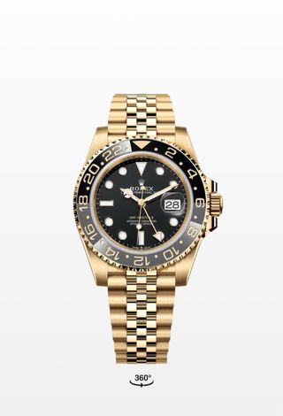 Reloj GMT-Master II con caja y brazalete de oro. - Bisel giratorio bidireccional con disco Cerachrom de dos tonos. - Esfera negra. - Ventana de fecha con lente Cyclops. movimiento automatico