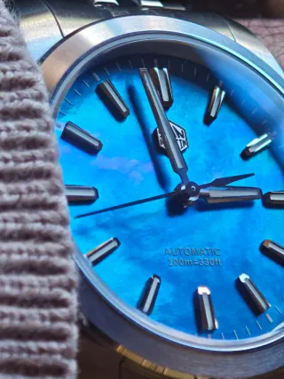 Elegante reloj San Martin con esfera azul de nácar, contrastes según incide la luz. Alta calidad de la manufactura San Martin, calibre Miyota, armis alta calidad con mecanismo de micro ajuste rápido - Movimiento automático. - Resistencia al agua de 100m (330ft). - Diseño moderno y versátil.