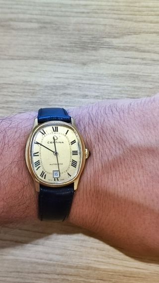 Certina automático vintage (Swiss Made, años 70/80) Reloj Certina automático suizo, elegante y clásico, funcionando. Caja chapada en oro (con desgaste por el uso, normal en relojes de la época). Esfera dorada con números romanos y ventana de fecha a las 6. Un reloj elegante y coleccionable, perfecto para amantes de la relojería suiza vintage o para lucir con estilo clásico.