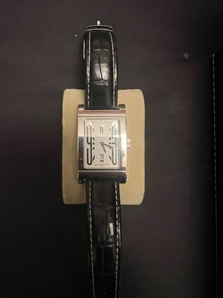 Elegante reloj Bvlgari modelo Rettangolo con correa de piel. - Caja rectangular de acero inoxidable. - Esfera plateada con detalles negros. - Indicador de fecha. - Correa de piel negra con pespuntes blancos.