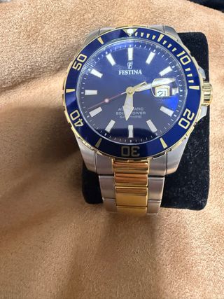 Elegante reloj Festina para hombre con un diseño deportivo y sofisticado. - Esfera de color azul profundo. - Bisel giratorio en azul y dorado. - Correa de acero inoxidable con detalles dorados. - Cristal de zafiro resistente a arañazos. - puesto solo en un par de ocasiones - cuenta con su caja Negociable