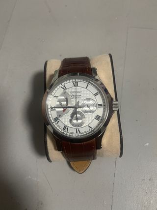 Elegante reloj Seiko Premier con correa de cuero marrón y esfera blanca. - Diseño clásico y sofisticado. - Correa de cuero de alta calidad. - Esfera con detalles texturizados.