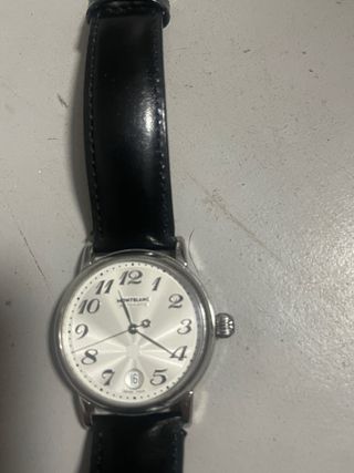Elegante reloj Montblanc con correa de cuero negra. - Esfera plateada con números arábigos. - Cierre de hebilla metálica.