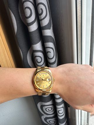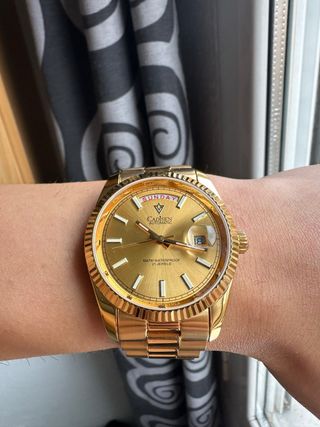 Reloj Cadisen Automático - Miyota 2815 (Day-Date) Reloj Cadisen automático con movimiento japonés Miyota 2815, fiable y robusto. Diseño clásico tipo Day-Date con acabado dorado, elegante y atemporal. Cuenta con día de la semana a las 12 y fecha con lupa a las 3, ofreciendo una lectura clara y práctica para el día a día. Características: • Movimiento automático Miyota 2815 • Función día y fecha (Day-Date) • Caja y brazalete de acero inoxidable Acabado dorado • Cristal mineral • Bisel estriado • Resistencia al agua 100 m • Funcionando correctamente Se entrega tal como se ve en las fotos, incluye correa extra. Envío rápido y bien prote