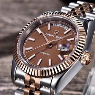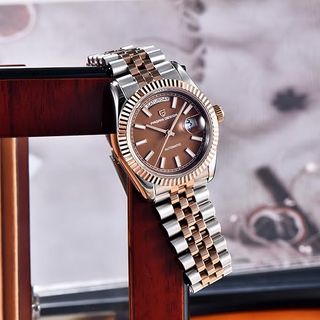 Elegante reloj automático Pagani Design con un diseño clásico y sofisticado. Perfecto para cualquier ocasión. - Esfera en tono marrón. - Detalles en oro rosa. - Correa de eslabones bicolor.