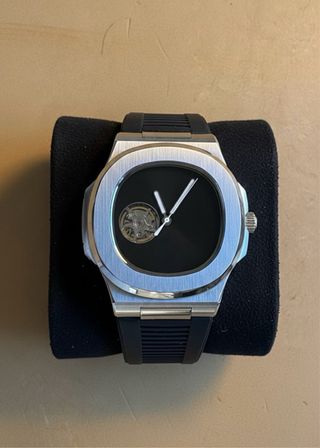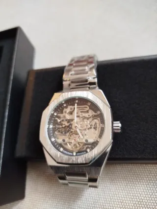 Reloj automático con un diseño moderno y elegante. - Esfera negra con detalles plateados. - Correa de metal plateado. - Mecanismo visible en la esfera.