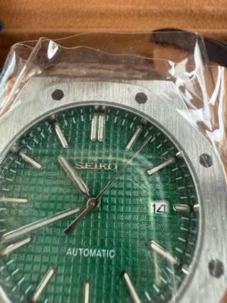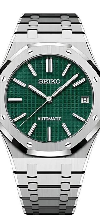 Elegante reloj Seiko con un llamativo diseño. - Esfera de color verde con un patrón texturizado. - Brazalete de acero inoxidable plateado. - Cierre desplegable.