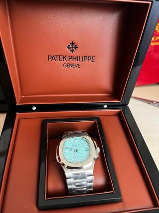 Elegante reloj con una llamativa esfera turquesa. - Diseño clásico inspirado en Patek Philippe. - Correa de metal plateado.