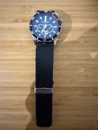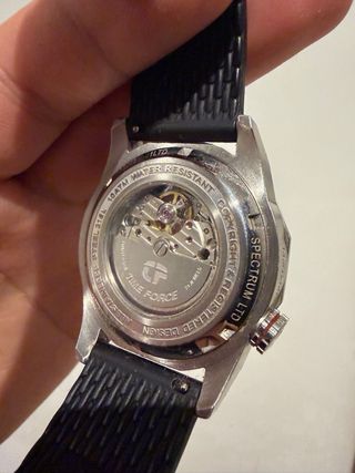 Time Force Spectrum LTD – Automático Reloj automático (sin pila), funcionando perfectamente. Esfera azul con ligeros micro-rayones poco visibles por el uso normal. Caja de acero inoxidable, bisel giratorio y correa de goma negra. Fondo transparente y resistencia al agua 10 ATM. Se vende solo el reloj, sin caja ni papeles. Precio algo negociable. Más fotos o vídeo funcionando sin problema.