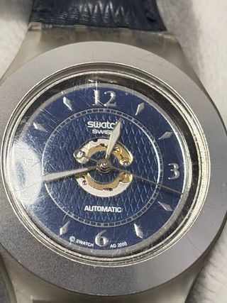 Reloj Swatch automático con esfera azul y detalles plateados. Un accesorio elegante y funcional. - Diseño automático. - Correa de cuero azul. Tal y como en la foto 100