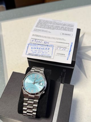 Reloj Citizen Tsuyosa NJ0151-88M con una llamativa esfera azul. - Esfera de color Azul Tiffany. - Brazalete de acero inoxidable. - Mecanismo automático. - Cristal de zafiro resistente a arañazos.