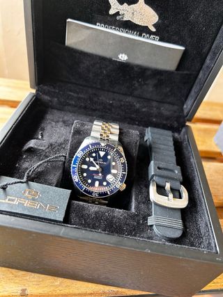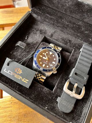 Reloj Lorenz Diver Shark automático, con 200 metros de resistencia al agua, en excelente estado y conjunto completo (Full Set). Incluye caja original, documentación, garantía y dos correas: una Jubilee de acero inoxidable y otra de goma tipo diver. 🔹 Movimiento automático de alta precisión 🔹 Caja de acero inoxidable de 42 mm 🔹 Bisel giratorio unidireccional 🔹 Esfera negra con marcadores luminiscentes 🔹 Resistencia al agua: 200M 🔹 Año reciente, con muy poco uso 📦 Full Set: caja + documentación + 2 correas