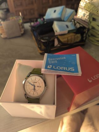 Reloj automático de la marca Lorus con correa de cuero verde y detalles plateados. Mecanismo Seiko NH-35 - Esfera con diseño texturizado. - Indicador de día y fecha.