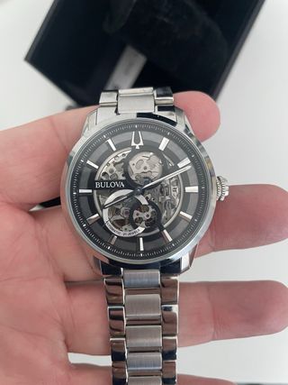 🔹 Nombre del modelo Bulova Automatic Skeleton (21 Jewels) En la tarjeta de garantía aparece la referencia: 96A208, que identifica el modelo exacto. 🔹 Características principales • Marca: Bulova • Movimiento: Automático (no usa pila, se carga con el movimiento de la muñeca) • Rubíes: 21 jewels (visible en la esfera) • Esfera: Skeleton (mecanismo visible) • Caja: Acero inoxidable • Brazalete: Acero inoxidable • Cristal: Mineral • Funciones: Horas, minutos y segundero central • Diámetro de caja: Aproximadamente 42 mm • Resistencia al agua: 30 m (3 ATM – salpicaduras, no para nadar) 🔹 Estilo y uso • Estilo elegante / clási