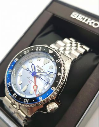 Reloj Seiko con movimiento GMT automático y esfera en tono azul claro. La correa es de acero inoxidable plateado. Full set año 2026. PvP 520. - Bisel giratorio bidireccional. - Indicadores de hora luminosos. - Cierre desplegable de seguridad.