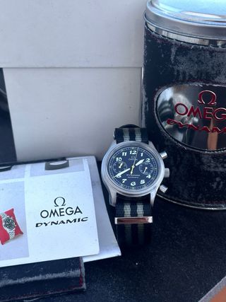 Reloj Omega Dynamic Chronograph automático con esfera negra. - Correa de tela a rayas. - Bisel con escala taquimétrica. - Subesferas para cronómetro. - Dotacion completa excepto tarjeja Somos profesionales todos nuestros articulos tienen 6 meses de garantia en su funcionamiento