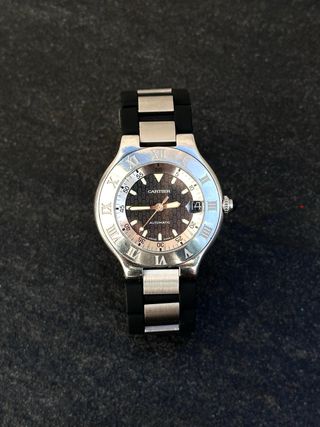 Reloj Cartier 21 Autograph con caja de 37mm. Un diseño elegante y deportivo. - Esfera con patrón guilloché. - Indicadores horarios en números romanos. - Correa mixta de acero y caucho. *Somos profesionales todos nuestros articulos tienen 6 meses de garantia en su funcionamiento.