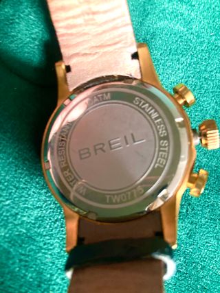 Elegante reloj Breil con un diseño deportivo y sofisticado. - Reloj nuevo con etiqueta y estuche original. - Esfera verde con detalles dorados. - Correa origibal marrón. - Bisel con taquímetro. - El reloj está tal cual se ve en las fotos.