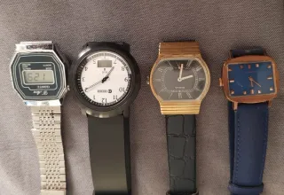 Conjunto de cuatro relojes para hombre. - Reloj D'Ace con correa plateada. - Reloj Eurochron con correa negra. - Reloj Pobeda con correa dorada. Cuerda - Reloj Breil correa azul cuerda. 60€ los 4